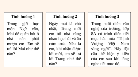 Tình huống 1 Tình huống 2 Tình huống 3 Trong giờ học Ngày mai là chủ Trong buổi diễn văn môn Ngữ văn, nhật, Trang mời nghệ của trường, lớp Mai để quên bút ở em tới nhà cùng 8A có trình diễn tiết nhà nên phải nhau học bài và ăn mục hát múa “Thịnh mượn em. Em sẽ cơm trưa. Nếu là Vượng Việt Nam trả lời Mai như thế em, khi nhận được sáng ngời”. Hãy đặt nào? lời mời, em sẽ trả câu thể hiện ý kiến lời Trang như thế của em sau khi lắng nào? nghe tiết mục đó. Bài 8: TRUYỆN LỊCH SỬ VÀ TIỂU THUYẾT Thực hành tiếng Việt I. Lý thuyết