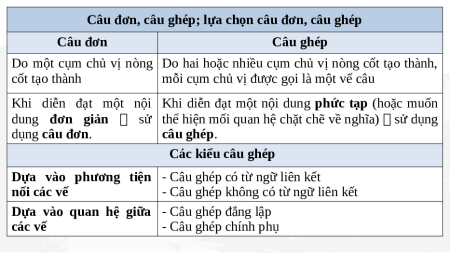 Câu đơn, câu ghép; lựa chọn câu đơn, câu ghép Câu đơn Câu ghép Do ……tạo thành