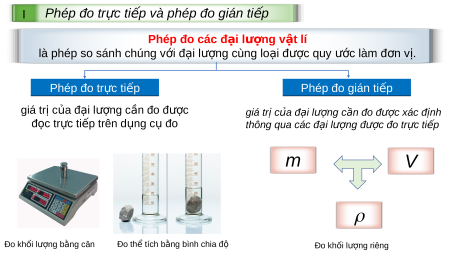 ế và phép đo gián ti p ế Phép đo các đ i ạ lư n ợ g v t ậ lí là phép so sánh chúng v i ớ đ i ạ lư ng ợ cùng lo i ạ đư c ợ quy ư c ớ làm đ n ơ v .ị Ph P ép đo tr t c ự tit p ế Phép đo p gi án tit p ế giá tr ịcủa đại l n ượ g c n ầ đo đ c ượ giá trị của đ i l ạ ư n ợ g c n ầ đo đư c x ợ ác đ n ị h đ c ọ trực ti p ế trên d n ụ g c ụ đo thông qua các đ i ạ lư n ợ g đư c đ ợ o tr c t ự i p ế m V Đo khối lượng b ng ằ cân Đo th ể tích b n ằ g bình chia đ ộ Đo khối lượng riêng