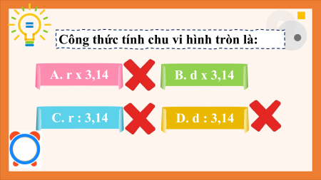 Công thức tính chu vi hình tròn là: A. r x 3,14 B. d x 3,14 C. r : 3,14 D. d : 3,14