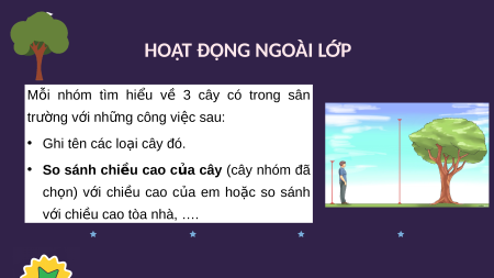 HOẠT ĐỘNG NGOÀI LỚP M i ỗ nhóm tìm hi u ể v ề 3 cây có trong sân trường v i ớ nh n ữ g công vi c ệ sau: • Ghi tên các lo i ạ cây đó. • So sánh chi u ề cao c a