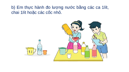 b) Em thực hành đo lượng nước bằng các ca 1lít,