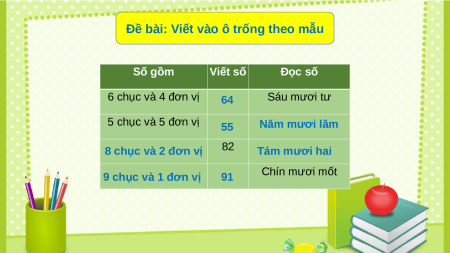 Đề bài: Viết vào ô trống theo mẫu Số gồm Viết số Đọc số 6 chục và 4 đơn vị Sáu mươi tư 64 5 chục và 5 đơn vị 55 Năm mươi lăm 82
