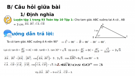 Luyện tập 1 trang 93 Toán lớp 10 Tập 1: Cho tam giác ABC vuông tại A có , AB = 3 cm. Tính