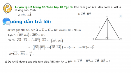 Luyện tập 2 trang 95 Toán lớp 10 Tập 1: Cho tam giác ABC đều cạnh a, AH là đường cao. Tính: