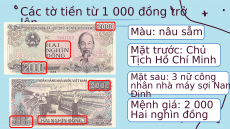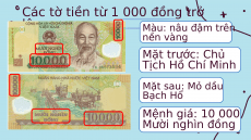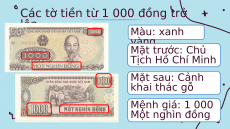 Các tờ tiền từ 1 000 đồng trở lên. Màu: xanh vàng Mặt trước: Chủ Tịch Hồ Chí Minh Mặt sau: Cảnh khai thác gỗ Mệnh giá: 1 000 Một nghìn đồng