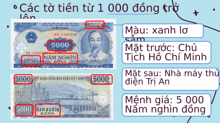Các tờ tiền từ 1 000 đồng trở lên. Màu: xanh lơ sẫm Mặt trước: Chủ Tịch Hồ Chí Minh Mặt sau: Nhà máy thủy điện Trị An Mệnh giá: 5 000 Năm nghìn đồng