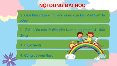 2. Giới thiệu các tờ tiền Việt Nam trong phạm vi 1000 đồng 3. Thực hành 4. Củng cố kiến thức