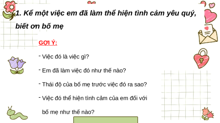 - Việc đó thể hiện tình cảm của em đối với bố mẹ như thế nào? CHIA SẺ NHÓM ĐÔI