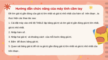 1. Cài đặt máy vào chế độ TABLE lập bảng giá trị và tìm giá trị gần đúng giá trị lớn nhất, giá trị nhỏ nhất. 2. Nhập hàm số .