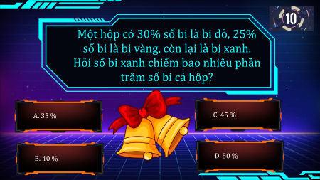 Tỉ số % của 45 và 50 là: A. 70 % C. 50 % B. 80 % D. 90 % 2 của 150 = … 5 A. 60 C. 50 B. 65 D. 70