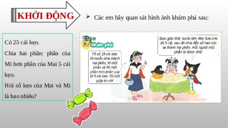 Các em hãy quan sát hình ảnh khám phá sau: Có 25 cái kẹo. Chia hai phần: phần của