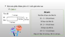 Hai lần số kẹo của Mai là: 25 – 5 = 20 (cái kẹo) Số kẹo của Mai là: 20 : 2 = 10 (cái kẹo) Số kẹo của Mi là: 10 + 5 = 15 (cái kẹo)