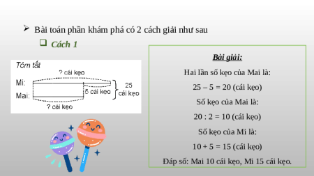 Đáp số: Mi 15 cái kẹo, Mai 10 cái kẹo.
