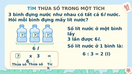 Số lít nước ở 1 bình là: ? x 3 = 6 : 3 = 2 (l) 6 Thừa số Thừa số Tíc h