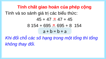 Tính và so sánh giá trị các biểu thức: 45 + 47 ... 47 + 45 = 8 154 + 695 ... 695 + 8 154 = a + b = b + a