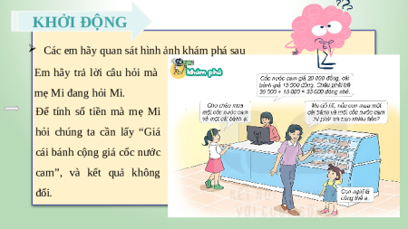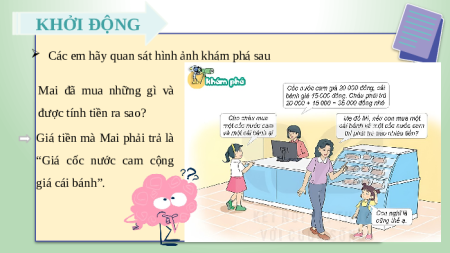 Các em hãy quan sát hình ảnh khám phá sau Mai đã mua những gì và được tính tiền ra sao?