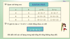 TIẾT 1: TÍNH CHẤT GIAO HOÁN CỦA PHÉP CỘNG Quan sát bảng sau: KHÁM PHÁ a b a + b b + a 4 3 4 + 3 = 7 3 + 4 = 7 6 9 6 + 9 = 15 9 + 6 = 15 8 5 8 + 5 = 13 5 + 8 = 13