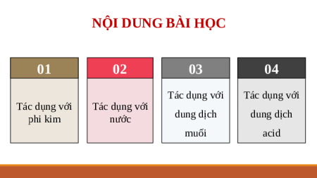 TÍNH CHẤT HÓA HỌC CỦA KIM LOẠI NỘI DUNG BÀI HỌC 01 02 03 04 Tác dụng với Tác dụng với Tác dụng với Tác dụng với phi kim nước dung dịch dung dịch muối acid