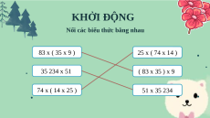 Nối các biểu thức bằng nhau 83 x ( 35 x 9 ) 25 x ( 74 x 14 ) 35 234 x 51 ( 83 x 35 ) x 9 74 x ( 14 x 25 ) 51 x 35 234 BÀI 42 TIẾT 1 T TÍNH CHẤT ÍNH CHẤT PHÂN PHỐI CỦA PHÂN PHỐI CỦA PHÉP PHÉP NH NH ÂN ĐỐ ÂN ĐỐI I VỚI PH VỚI PHÉP ÉP CỘNG CỘNG