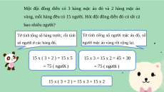 người mặc áo vàng rồi cộng lại. 15 x ( 3 + 2 ) = 15 x 5 15 x 3 + 15 x 2 = 45 + 30 = 75 ( người ) = 75 ( người )