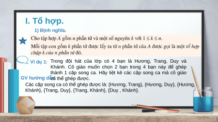 - Trọn bộ bài giảng powerpoint Toán 10 Chương 5 Bài 3: Tổ hợp Cánh diều năm 2023 hay nhất được thiết kế theo phong cách hiện đại, đẹp mắt giúp Giáo viên có thêm nhiều ý tưởng khi giảng dạy.