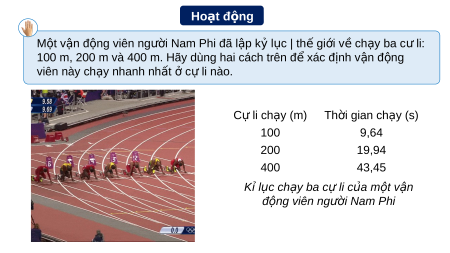 100 m, 200 m và 400 m. Hãy dùng hai cách trên đ ể xác đ nh ị v n ậ đ n ộ g viên này ch y ạ nhanh nh t ấ ở c ự li nào. C ự li ch y ạ (m) Th i ờ gian ch y ạ (s) 100 9,64 200 19,94 400 43,45 Kỉ l c ụ ch y ạ ba c ự li c a ủ m t ộ v n ậ đ ng ộ viên ngư i ờ Nam Phi