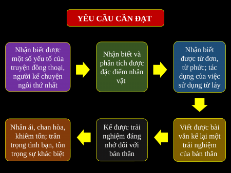 YÊU CẦU CẦN ĐẠT Nhận biết được Nhận biết Nhận biết và một số yếu tố của được từ đơn, phân tích được truyện đồng thoại, từ phức; tác đặc điểm nhân người kể chuyện dụng của việc vật ngôi thứ nhất sử dụng từ láy Nhân ái, chan hòa, Kể được trải Viết được bài khiêm tốn; trân nghiệm đáng văn kể lại một trọng tình bạn, tôn nhớ đối với trải nghiệm trọng sự khác biệt bản thân của bản thân PHẦN ĐỌC TRI THỨC NGỮ VĂN Truyện Từ đơn