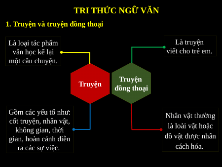 1. Truyện và truyện đồng thoại Là loại tác phẩm Là truyện văn học kể lại viết cho trẻ em. một câu chuyện. Truyện Truyện đồng thoại Gồm các yếu tố như: Nhân vật thường cốt truyện, nhân vật, là loài vật hoặc không gian, thời gian, hoàn cảnh diễn đồ vật được nhân ra các sự việc. cách hóa.