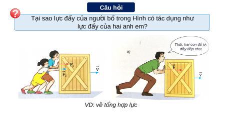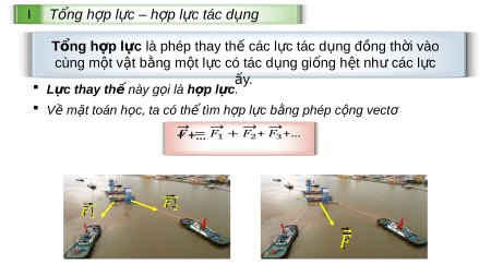 ầ Thủ Thiêm (TP HCM) b ng ằ hai l c ự và nh ư hình - Tàu ch ở hàng s ẽ chuy n ể đ ng ộ theo hư ng ớ nào? - Làm th ế nào đ ể tính đư c ợ đ ộ l n ớ c a ủ l c ự kéo tác d ng ụ lên tàu ch ở hàng? ⃗ � 2 Các tàu lai d t ắ h ệ th ng ố ⃗ � 1 n ố g ng m ầ trong quá trình xây d ng ự h m ầ Th ủ Thiêm, TP H ồ Chí Minh. I Tổng hợp l c ự – h p ợ l c ự tác d ng ụ Tổng h p ợ l c ự là phép thay th ế các l c ự tác d ng đ ụ ng t ồ h i v ờ ào cùng một v t ậ b ng ằ m t ộ l c ự có tác d ng ụ gi ng h ố t ệ nh c ư ác l c ự y ấ . L c ự thay th ế này g i ọ là h p ợ l c ự . V ề m t ặ toán h c, ọ ta có th ể tìm h p ợ l c ự b ng ằ phép c ng ộ vectơ + +… ⃗ � 2 ⃗ � 1 ⃗� Câu h i ỏ T i ạ sao l c ự đ y ẩ c a ủ ngư i b ờ t ố rong Hình có tác d ng ụ nh ư l c ự đẩy c a ủ hai anh em? VD: v ề t ng ổ h p ợ l c ự