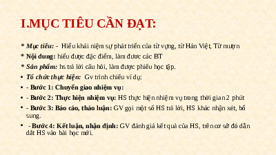 * Mục tiêu: - Hiểu khái niệm sự phát triển của từ vựng, từ Hán Việt, Từ mượn