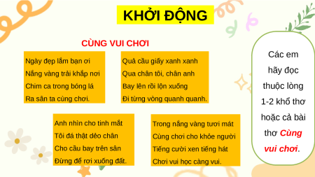 Nắng vàng trải khắp nơi Qua chân tôi, chân anh Chim ca trong bóng lá Bay lên rồi lộn xuống thuộc lòng Ra sân ta cùng chơi. Đi từng vòng quanh quanh. 1-2 khổ thơ hoặc cả bài Anh nhìn cho tinh mắt Trong nắng vàng tươi mát thơ Cùng Tôi đá thật dẻo chân
