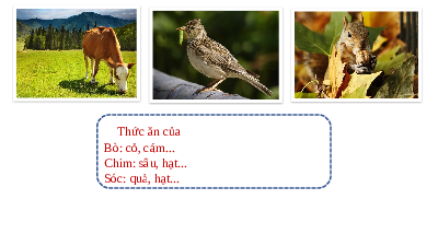 Thức ăn của Thỏ: rau, cỏ Bò: cỏ, cám... Chim: sâu, hạt... Sóc: quả, hạt... BÀI 26 TRAO ĐỔI NƯỚC VÀ CHẤT DINH DƯỠNG Ở ĐỘNG VẬT NỘI DUNG BÀI HỌC