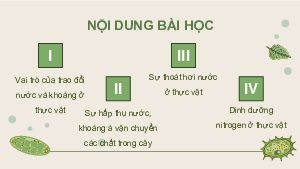 VÀ KHOÁNG Ở THỰC VẬT NỘI DUNG BÀI HỌC I III Vai trò của trao đổi Sự thoát hơi nước nước và khoáng ở II ở thực vật IV thực vật Sự hấp thụ nước, Dinh dưỡng khoáng à vận chuyển nitrogen ở thực vật các chất trong cây