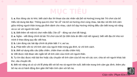 1. a. Đọc đúng các từ khó, biết cách đọc lời thoại của các nhân vật (bố và Hường) trong bài Trò chơi của bố.