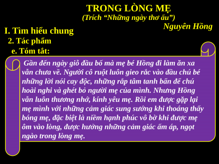 (Trích “Những ngày thơ ấu”) Nguyên Hồng I. Tìm hiểu chung 2. Tác phẩm e. Tóm tắt: