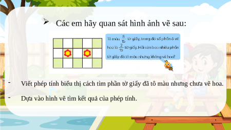 Viết phép tính biểu thị cách tìm phần tờ giấy đã tô màu nhưng chưa vẽ hoa. -