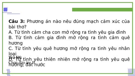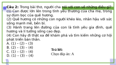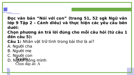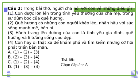 Câu 1: Nhân vật trữ tình trong bài thơ là ai? A. Người cha B. Người mẹ C. Người con D. Ngư Tr ời ả đồ lời: ng mình Chọn đáp án: A