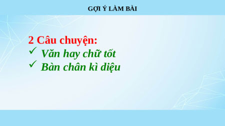 - 1 bài văn tả người (hoặc 1 bài báo về việc học và hành). GỢI Ý LÀM BÀI 2 Câu chuyện: