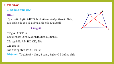Nhận xét Tứ giác có 4 đỉnh, 4 cạnh, 4 góc và 2 đường chéo I. TỨ GIÁC