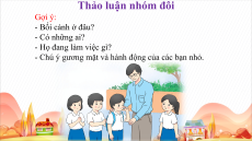 Thảo luận nhóm đôi Gợi ý: - Bối cảnh ở đâu? - Có những ai? - Họ đang làm việc gì?
