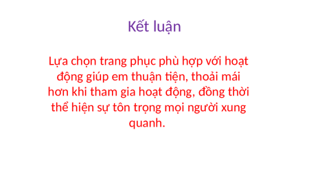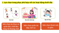 2. Lựa chọn trang phục phù hợp với các hoạt động dưới đây Nên chọn áo thun và Nên chọn thoái mái, quần đùi, chất liệu Nên chọn quần áo co giãn. rộng rãi thoáng mát đẹp, lịch sự. Em đã từng lựa chọn Vào ngày cuố Những quần áo việi t c uần e gì e chưa ph m m ù hợp tv thường hường à khô x ng làm g uy t ê hấy t ì? n tự làm hoải không cần ai nhắc? mái chưa?