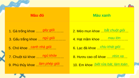 nhóm 2 là màu xanh và điền từ còn thiếu vào chỗ trống.