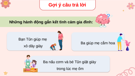 Những hành động gắn kết tình cảm gia đình: Bạn Tũn giúp mẹ Ba giúp mẹ cắm hoa xỏ dây giày