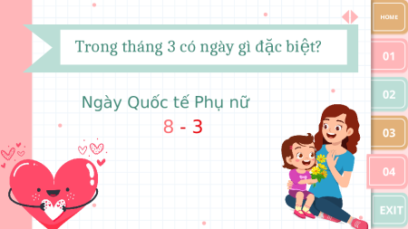 Trong tháng 3 có ngày gì đ c ặ bi t? ệ 01 Ngày Quốc tế Phụ nữ 02 8 - 3 03 04 EXIT