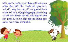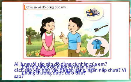 Kể tên một số đồ dùng cá nhân của em. Dép quần áo Ai l Em à n có n gười h s ữắn p g x đồ d ếp đ ù ồ ndg ù cnág n c hân á nh nào? ân của em? các Chh sún ắp g th xếpư ờn nh g ư đvư ậyợc đ đ ã ể ở gọn đgâu