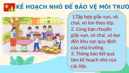 giấy vụn, vỏ chai, vỏ lon đến khu vực quy định của nhà trường. 3. Thông báo kết quả làm kế hoạch nhỏ của các lớp. Khen thưởng Cá nhân Tập thể