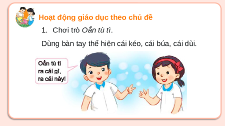 Dùng bàn tay thể hiện cái kéo, cái búa, cái dùi.