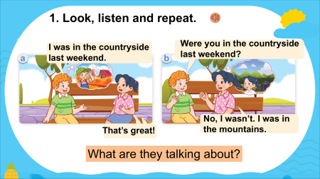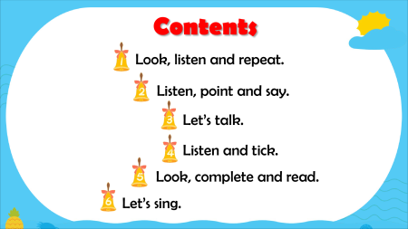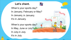 Monday, October 10th 2023 Unit 10 Lesson 1 Warm-up Let’s chant. When’s your sports day? In January, February or May? In January, in January. It’s in January. When’s your sports day? In May, June or July? In July,in July. It’s in July. Contents Look, listen and repeat. Listen, point and say. Let’s talk. Listen and tick. Look, complete and read. Let’s sing.