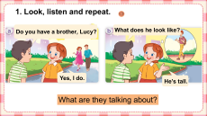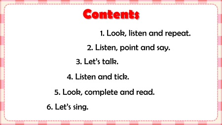 Monday, October 10th 2023 Unit 13 Lesson 1 Warm-up Let’s chant. Contents 1. Look, listen and repeat. 2. Listen, point and say. 3. Let’s talk. 4. Listen and tick. 5. Look, complete and read. 6. Let’s sing.